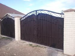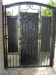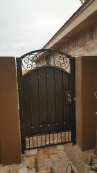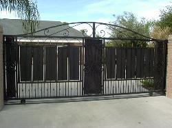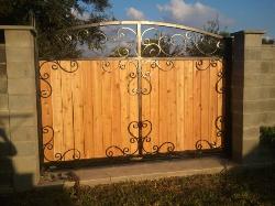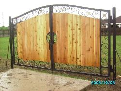 Privacy and semi-private gates can be built entirely out of metal or out of a combination of iron and wood. Arches or decorative ornamental iron work can be added to privacy gates while still keeping your home enclosed and private from people passing by. A combination of iron and wood gates can be fabricated. these gates are built using iron square tubing frame. Frames can be built to swing or slide open. This combination goes well when privacy is need. These iron and wood gates go perfectly with existing ceder fences. Since gates are made with a iron frame they are far more durable than doors that are made entirely from wood. |