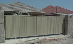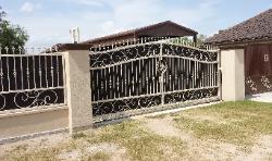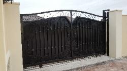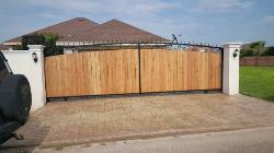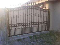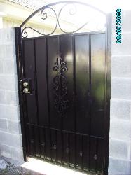 Iron and wood privacy gates can be built to either swing or slide. |